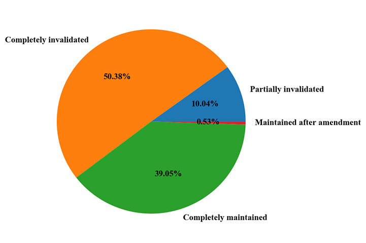 30,178 pieces of decision of invalidation (which, including those before 2008, at least have key information usable) are collected this time, wherein there are 15,203 pieces of decision of invalidation where the patent right is announced to be completely invalidated (hereinafter referred to as “completely invalidated”), accounting for 50.4% of the overall cases, there are 3,031 pieces of decision of invalidation where the patent right is announced to be partially invalidated (hereinafter referred to as “partially invalidated”), accounting for 10.0% of the overall cases, and there are 11,783 pieces of decision of invalidation where the patent right is maintained valid (hereinafter referred to as “completely maintained”), accounting for 39.0% of the overall cases, and there are 161 pieces of decision of invalidation where the patent right is maintained valid after amendment (hereinafter referred to as “maintained after amendment”), accounting for 0.5% of the overall cases. Accordingly, the decisions where the claims are at least partially invalidated account for over 60% of the overall cases.