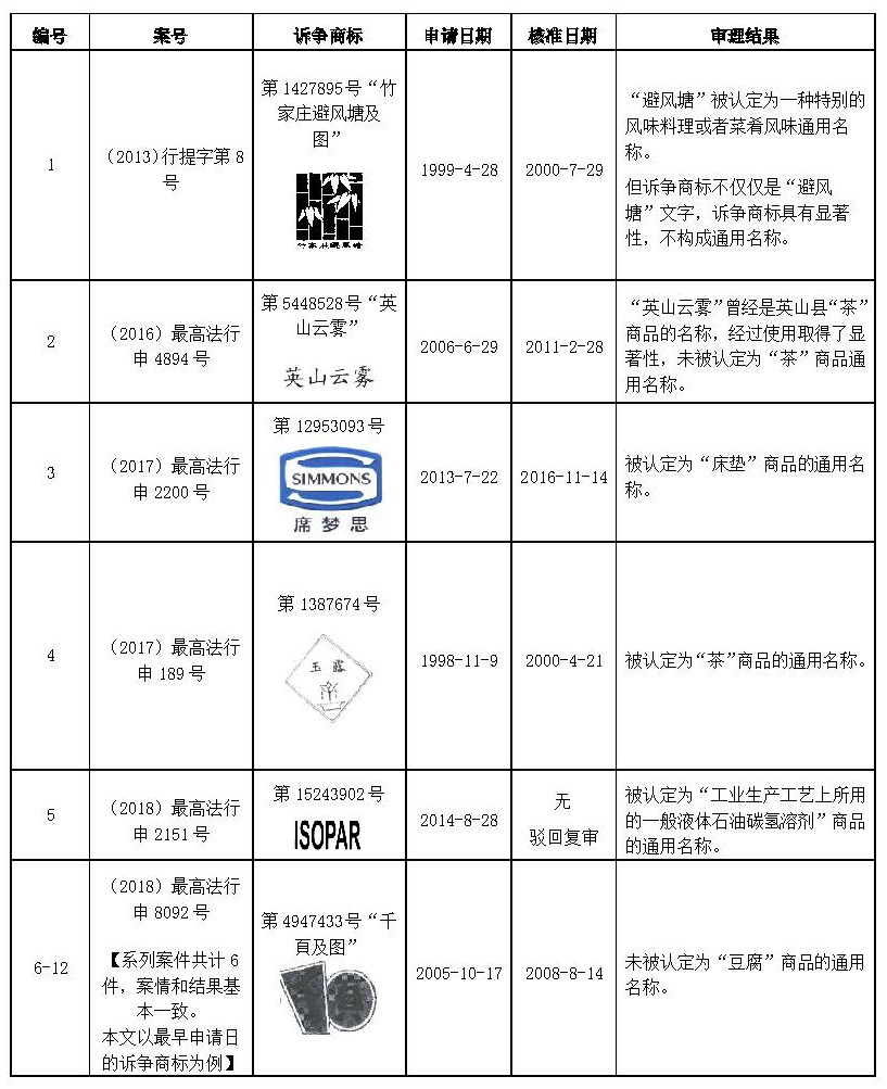 經(jīng)查閱從2015年至今,中國裁判文書網(wǎng)收錄最高人民法院涉及“通用名稱”商標(biāo)確權(quán)案件的行政裁判文書共計(jì)12份,包括11份行政裁定書和1份行政判決書,裁判作出的時(shí)間是2015年至2019年。筆者以這些文書為研究樣本,分析商標(biāo)確權(quán)中法院認(rèn)定通用名稱的考量因素和裁判標(biāo)準(zhǔn)。