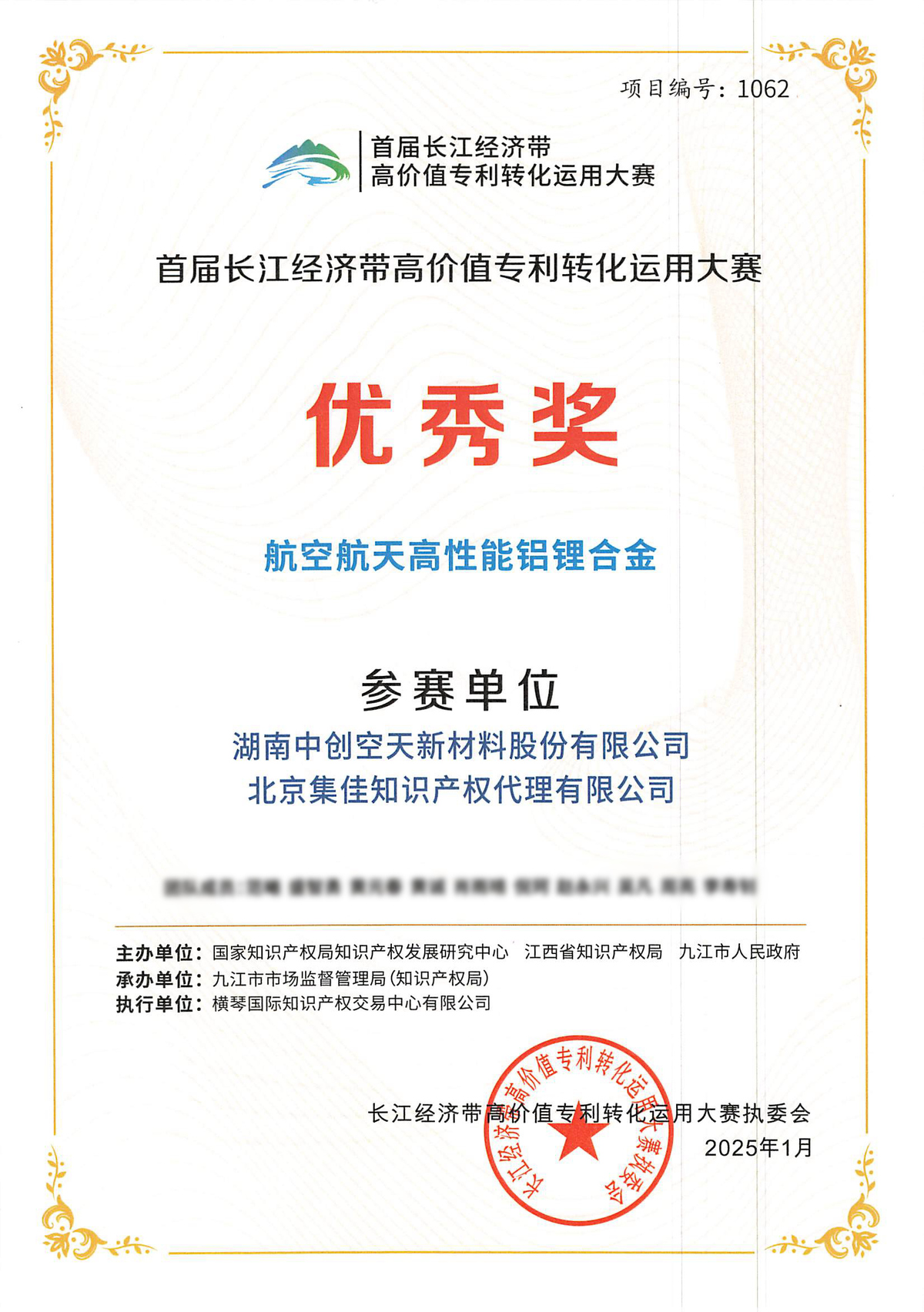 長江經濟帶高價值專利轉化運用大賽 | 集佳助力中創空天公司“航空航天高性能鋁鋰合金”項目榮獲“優秀獎”
